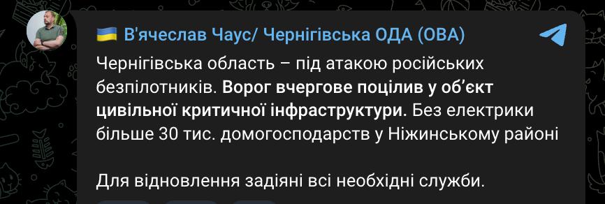 Удар по об'єкту інфраструктури був і у Ніжинському районі Чернігівської області, де залишилося без світла понад 30 тисяч домогосподарств. Про це повідомив голова Чернігівської ОВ В'ячеслав Чаус.