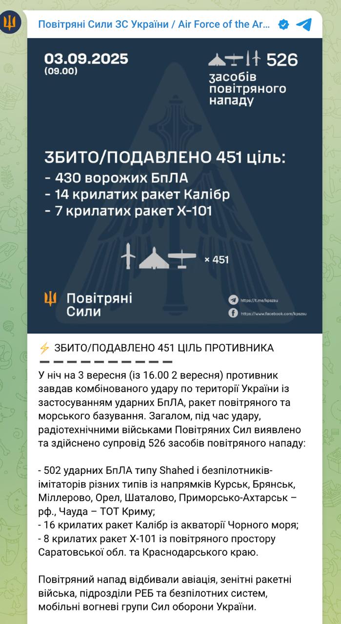 У Повітряних силах ЗСУ повідомили, що Україну вночі атакували 502 БПЛА та 24 крилаті ракети, було 72 прильоти. Збити вдалося 451 дрон ("Шахеди" та імітатори) та 21 ракету.