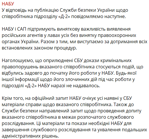 "Оприлюднені СБУ докази кримінальних правопорушень зазначеного співробітника стосуються подій, які сталися задовго до початку його роботи в НАБУ. Будь-якої іншої інформації про його злочинні дії під час роботи у підрозділі "Д-2" НАБУ на даний момент не надавалося", - заявляє відомство.