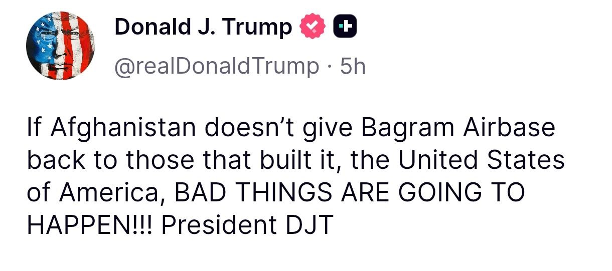 "Якщо Афганістан не поверне авіабазу Баграм тим, хто її збудував, Сполученим Штатам Америки, відбудуться погані речі!" – написав він.