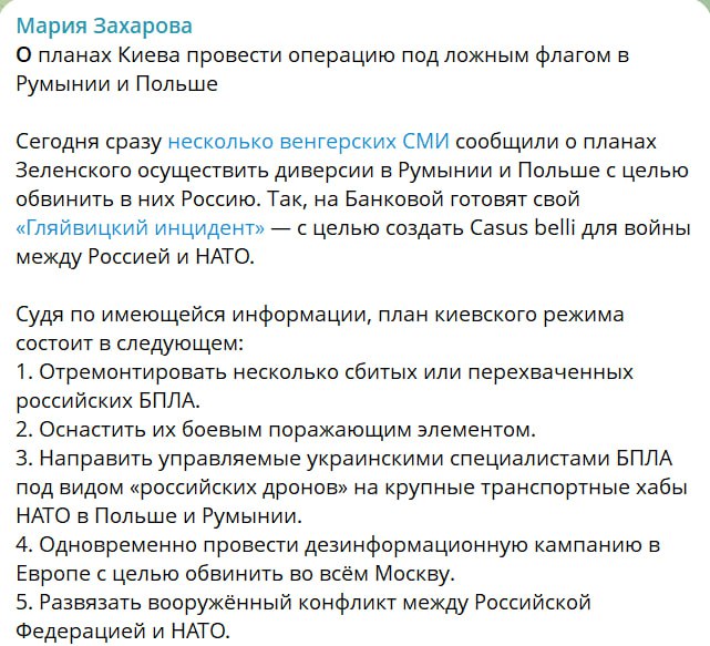 5. Розв'язати збройний конфлікт між Російською Федерацією та НАТО”, - пише Захарова.