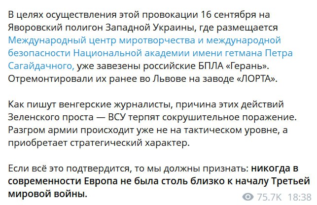 Спікер МЗС РФ стверджує, що "з метою здійснення цієї провокації 16 вересня на Яворівський полігон на заході України, де розміщується Міжнародний центр миротворчості та міжнародної безпеки Національної академії імені гетьмана Петра Сагайдачного, вже завезено російські БПЛА "Герань". Відремонтували їх раніше у Львові на заводі.