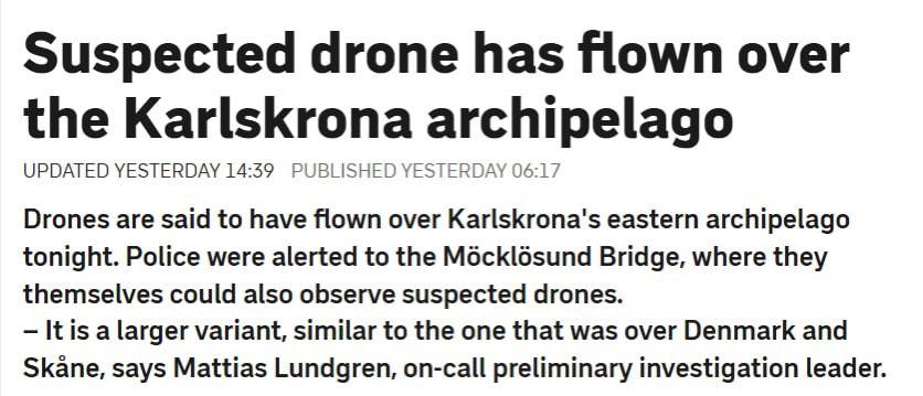 За інформацією видання, проліт підозрілих дронів зафіксований у небі над архіпелагом Карлскруна у Швеції, де розташована головна база Військово-морських сил країни.