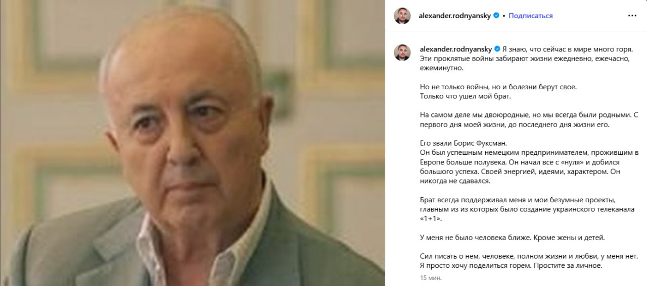 У мене не було людини ближче. Окрім дружини та дітей", - написав Роднянський.