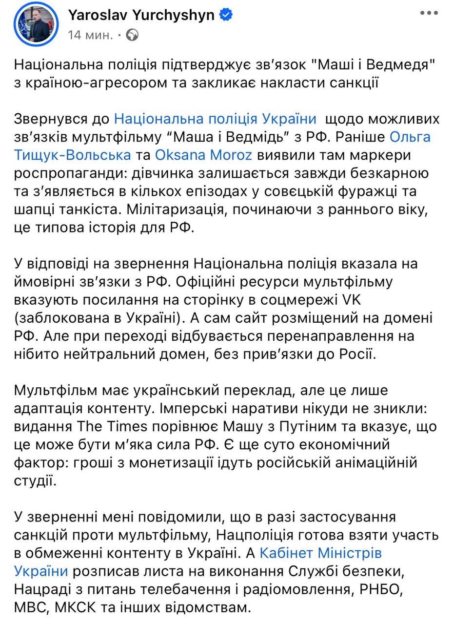 Юрчишин також додав, що у разі введення санкцій Нацполіція готова долучитися до обмеження мультфільму в Україні.