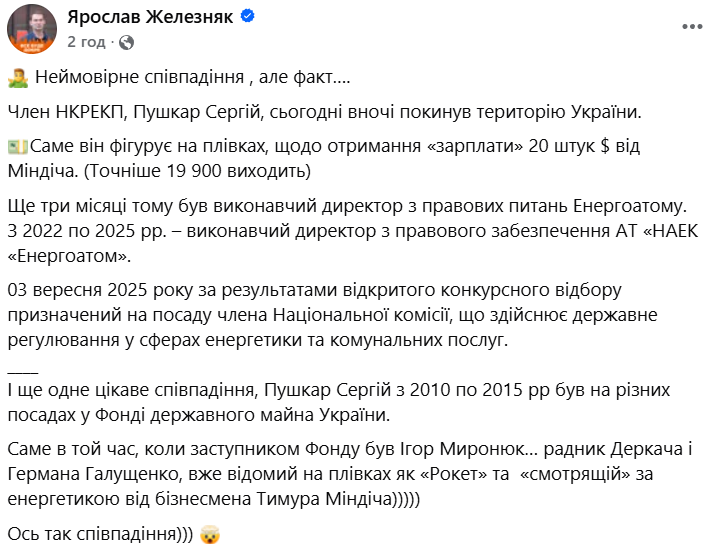 "І ще один цікавий збіг: Пушкар Сергій з 2010 по 2015 роки обіймав різні посади у Фонді державного майна України. Саме в той час, коли заступником Фонду був Ігор Миронюк... радник Деркача та Германа Галущенко, вже відомий по плівках як Рокет і дивиться за енергетикою від "Темпура". нардеп.