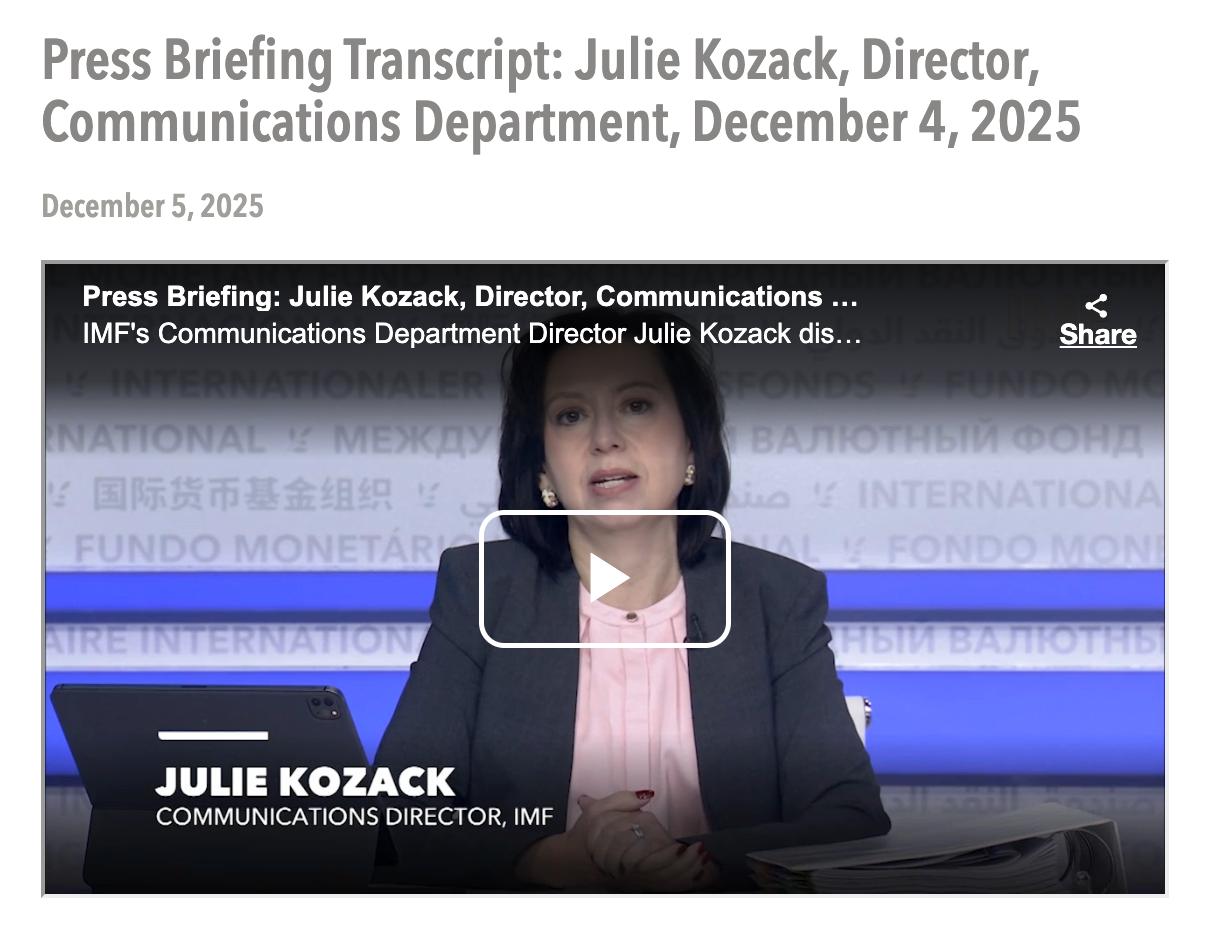 Прес-секретар Міжнародного валютного фонду Джулі Козак заявила, що однією з першочергових умов для надання Києву подальших кредитів було ухвалення державного бюджету на 2026 роки, і воно вже виконане. Попередня оцінка МВФ показує, що документ загалом відповідає зобов'язанням програми.