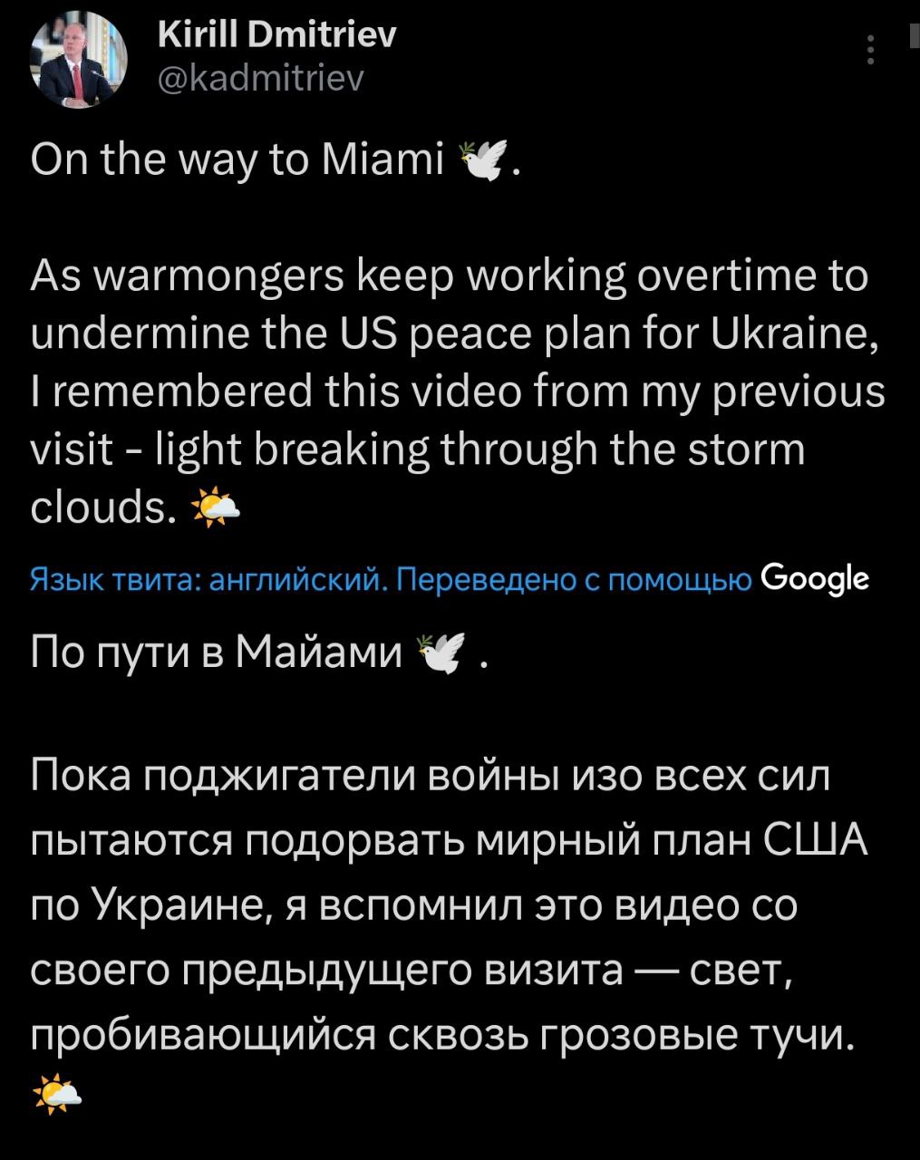 Сам Дмитрієв уже підтвердив, що він на шляху до Майамі, де зустрінеться з Віткоффом та Кушнером.