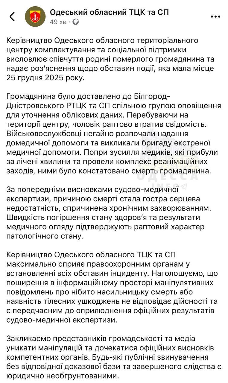 Одеський обласний ТЦК та СП цю версію заперечує. В офіційній заяві сказано, що чоловіка доставили до ТЦК для уточнення облікових даних, де він "раптово знепритомнів".