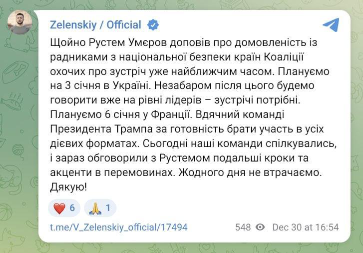 17.23 Зеленський пише, що 3 січня у Києві відбудеться зустріч радників із нацбезпеки у форматі коаліції охочих, після чого планується зустріч на рівні лідерів, попередньо 6 січня у Франції.
