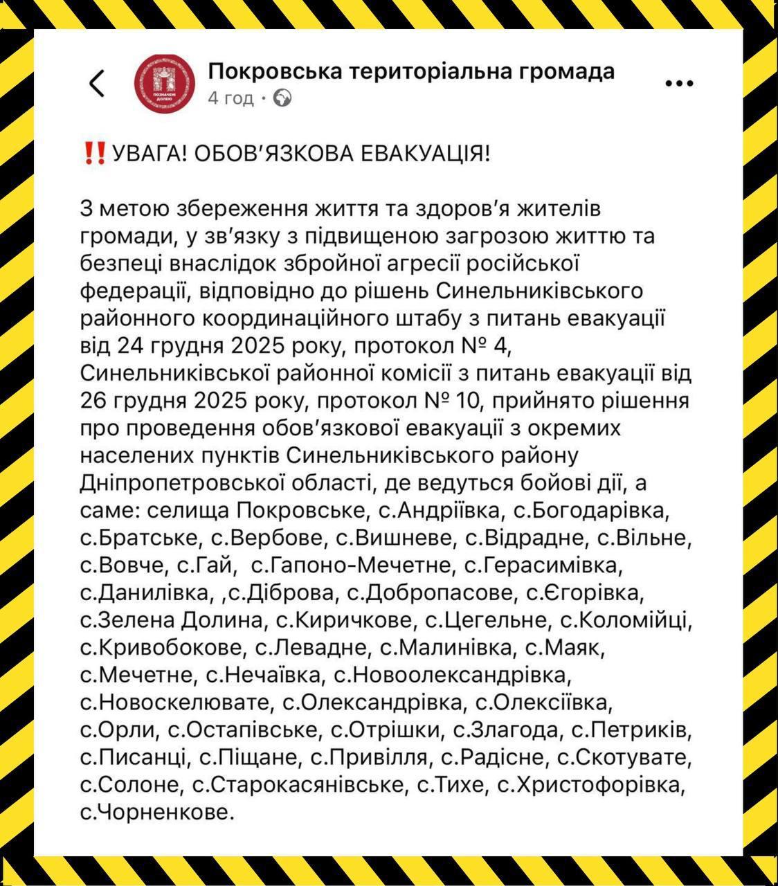15.01 На Дніпропетровщині оголосили про обов'язкову евакуацію понад 40 населених пунктів у Синельниківському районі, повідомляє Покровська громада.