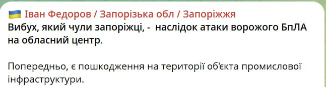 18.10 Запоріжжя зазнало атаки БпЛА, повідомив голова ОВА Федоров.