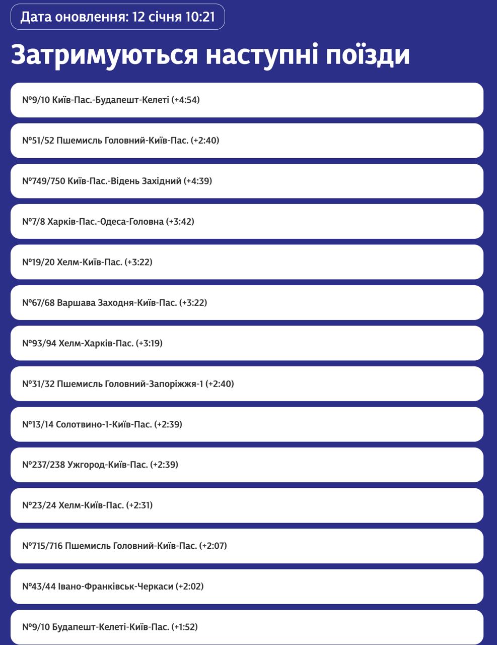 11.20 Декілька поїздів затримуються через нічний удар РФ по залізничній інфраструктурі, повідомляє "Укрзалізниця".