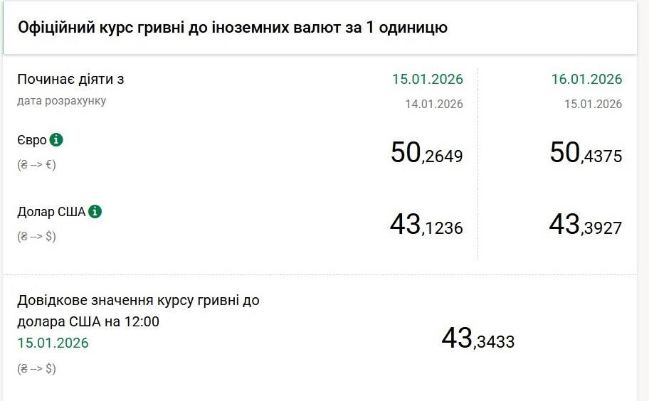 Сьогодні, 15 січня, Національний банк України знову опустив гривню та встановив нові максимуми за офіційним курсом на 16 січня: за доларом він досяг 43,3927 грн/$(плюс 27 копійок до вчорашнього рівня), а щодо євро - 50,4375 грн/€ (+ 17 копійок).
