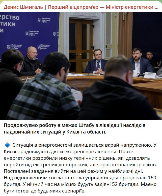 "Ситуація в енергосистемі залишається вкрай напруженою. У Києві продовжують діяти екстрені відключення. Проте енергетики розробили низку технічних рішень, що дозволяють перейти від екстрених до жорстких, але прогнозованих графіків", - написав у своєму Telegram-каналі міністр енергетики Денис Шмигаль.
