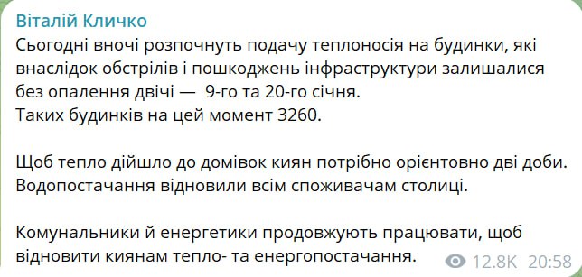 "Сьогодні вночі почнуть подачу теплоносія до будинків, які внаслідок обстрілів і пошкоджень інфраструктури залишалися без опалення двічі - 9-го та 20-го січня. Таких будинків на даний момент 3260. Щоб тепло дійшло до будинків киян, потрібно орієнтовно дві доби. Водопостачання відновили всім споживачам столи.