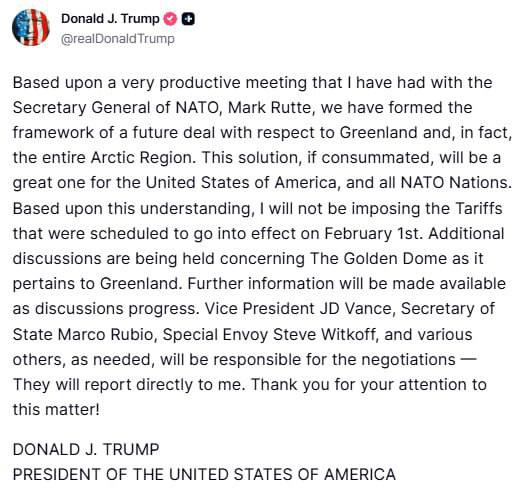 "Грунтуючись на дуже продуктивній зустрічі, яку я провів з генеральним секретарем НАТО Марком Рютте, ми сформували рамки майбутньої угоди щодо Гренландії і, по суті, всього Арктичного регіону. Це рішення, якщо воно буде закінчено, буде відмінним для Сполучених Штатів Америки і всіх країн НАТО. Ведуться додаткові обговорення щодо Золотого купола, оскільки він відноситься до Гренландії. Додаткова інформація буде надана в міру просування обговорень.