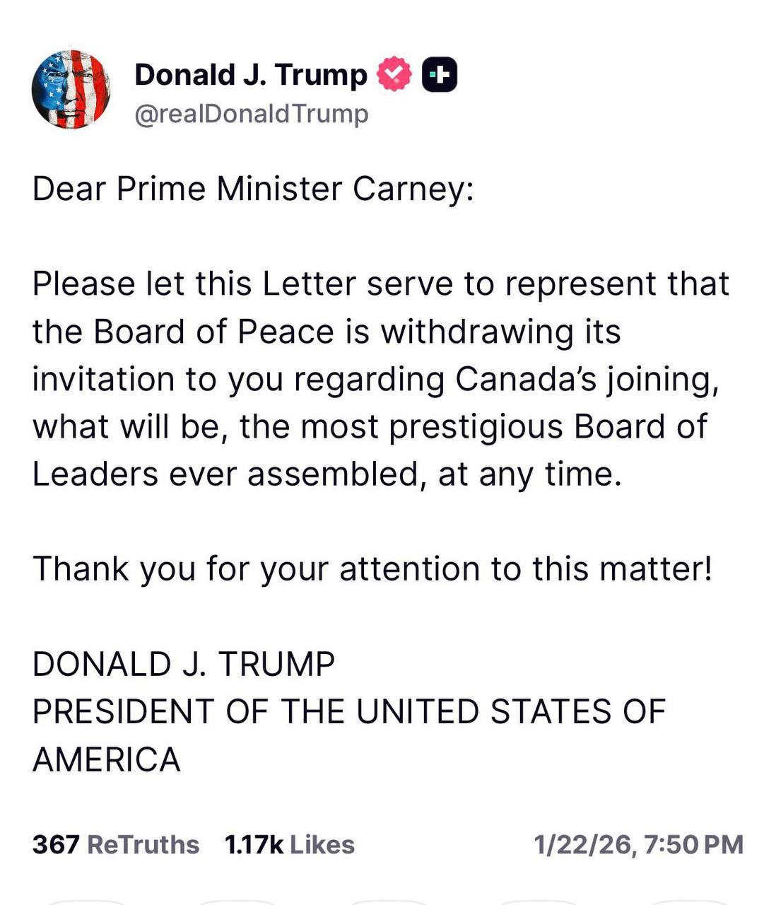 "Шановний прем'єр-міністр Карні! Прошу вас прийняти цей лист як підтвердження того, що Рада миру відкликає своє запрошення вам щодо приєднання Канади до найпрестижнішої колись створеної ради лідерів. Дякую вам за увагу до цього питання!" - сказано у публікації.