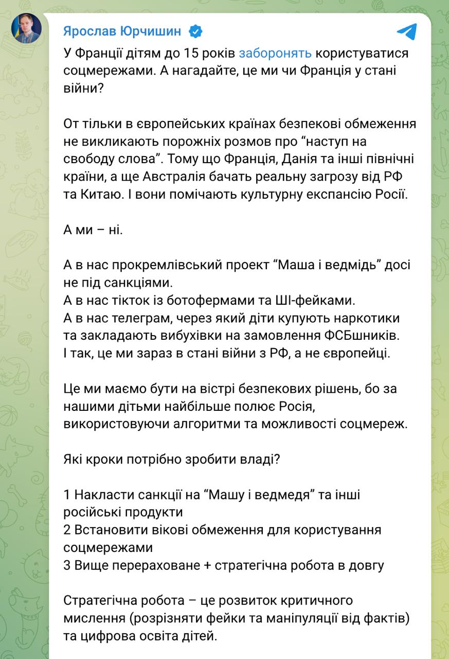 "У Франції дітям до 15 років заборонять користуватися соцмережами. А нагадайте, це ми чи Франція у стані війни? От тільки в європейських країнах безпекові обмеження не викликають порожніх розмов про "наступ на свободу слова". Тому що Франція, Данія та інші північні країни, а ще Австралія бачать реальну загрозу від РФ та Китаю. І вони помічають культурну експансію Росії. А ми – ні. А в нас прокремлівський проект "Маша і Ведмідь" досі не під санкціями. А в нас тікток із ботофермами та ШІ-фейками. А в нас телеграм, через який діти купують наркотики та закладають вибухівки на замовлення ФСБшників. І так, це ми зараз в стані війни з РФ, а не європейці", - написав Юрчишин.