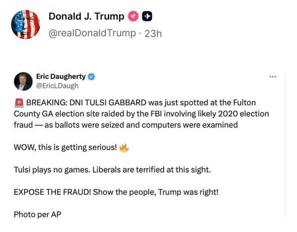 Під час обшуків було вилучено 700 ящиків із бюлетенями, заявила член ради округу Фултон. На місці обшуків була присутня директор Національної розвідки Тулсі Габбард.