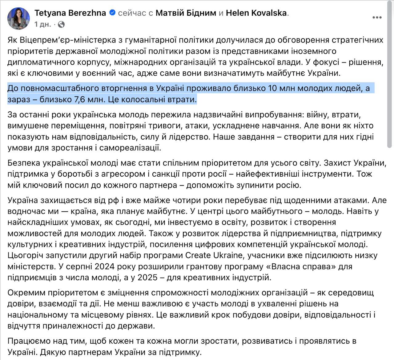 За роки повномасштабної війни в Україні поменшало на 2,4 мільйона молодих людей. Спочатку було 10 млн., а стало 7,6 млн.