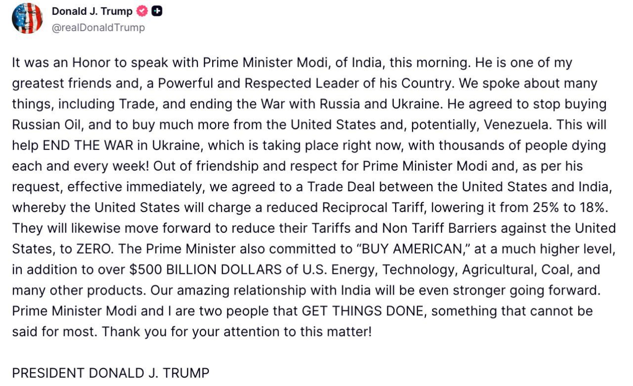 "Сьогодні вранці було честю поговорити з прем'єр-міністром Моді з Індії. Він один з моїх найбільших друзів і потужний і шановний лідер своєї країни. Ми говорили багато про що, включаючи торгівлю і завершення війни з Росією та Україною. Він погодився припинити купувати російську нафту і купувати набагато більше. в Україні, яка відбувається прямо зараз, з тисячами людей, які гинуть щотижня! зниженні своїх мит і нетарифних бар'єрів щодо Сполучених Штатів до нуля Прем'єр-міністр також зобов'язався "купити американське" на набагато більш високому рівні, на додаток до більш ніж 500 мільярдів доларів американської енергії, технологій, сільськогосподарської продукції, вугілля і багатьох інших людей. виконують справи, чого не можна сказати про більшість», – написав він.