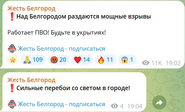 19.12 У Білгороді лунають вибухи. Місцеві паблики пишуть про ракетну атаку та роботу ППО. Вони повідомляють, що у частині міста зникло світло. Також пишуть і про перебої з водою.