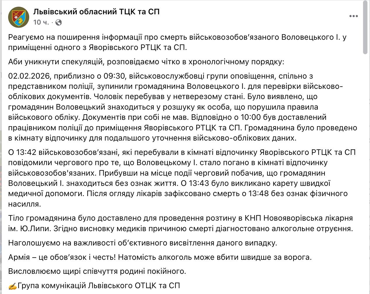 Львівський обласний ТЦК заявив, що чоловік на момент затримання був п'яний, оновлених військових документів не мав. Його відвезли до "кімнати відпочинку" до ТЦК до інших мобілізованих. Ті незабаром заявили черговому, що чоловікові стало погано. Він був без ознак життя, а лікарі вже за п'ять хвилин після першого звернення зафіксували смерть.