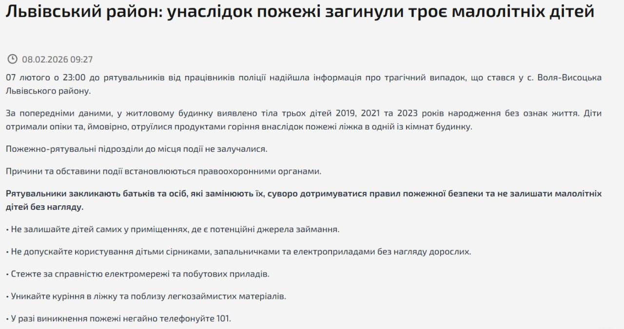 "07 лютого о 23:00 до рятувальників від співробітників поліції надійшла інформація про трагічний випадок, що стався у с. Воля-Висоцька Львівського району. За попередніми даними, у житловому будинку виявлено тіла трьох дітей 2019, 2021 та 2023 років народження без ознак життя. кімнат будинку", - йдеться у заяві.