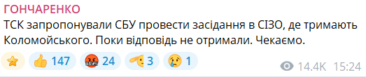 "Інформація про можливий замах на життя Коломойського вперше з моменту ув'язнення з'явилася під час доставки на засідання ТСК. Адвокати пов'язують цю заяву СБУ з інформацією, яку Коломойський може розповісти слідчій комісії, розглядаючи це як можливий тиск", - заявив Гончаренко.