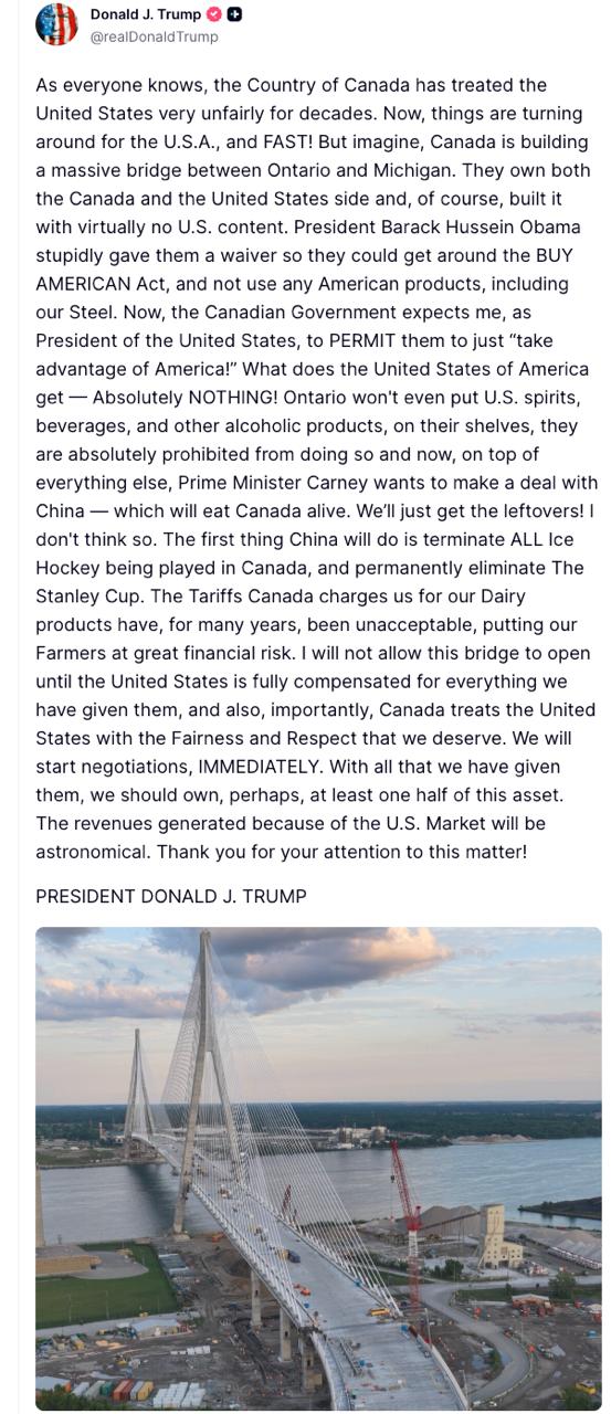 Президент США Дональд Трамп заявив, що не допустить відкриття мосту між канадською провінцією Онтаріо та американським штатом Мічиган, поки Канада не надасть Вашингтону половину прав власності на об'єкт.