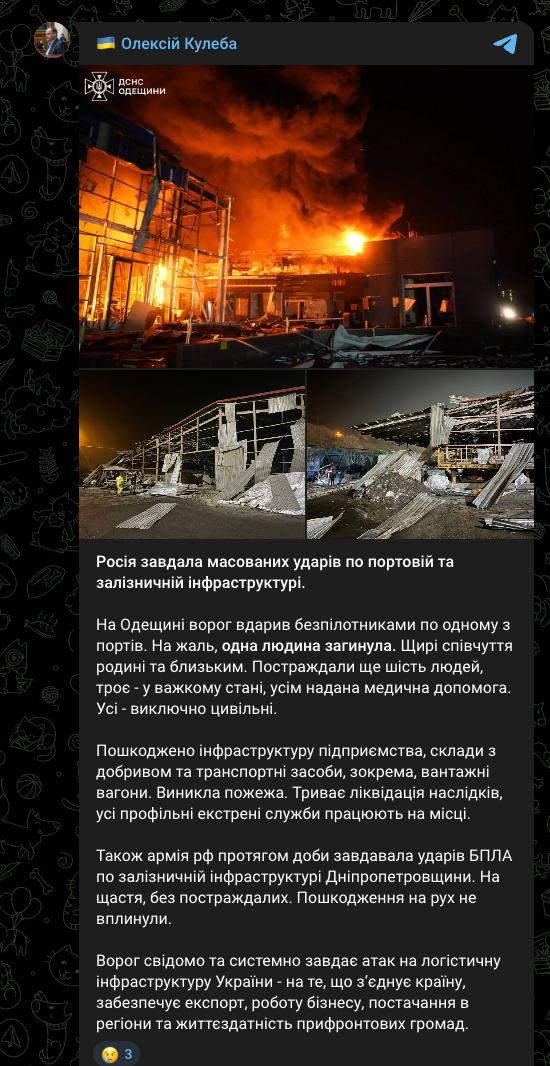 08:13 На Одещині внаслідок атаки дронів на порт загинула людина, ще шестеро отримали поранення, повідомив віце-прем'єр Кулеба.