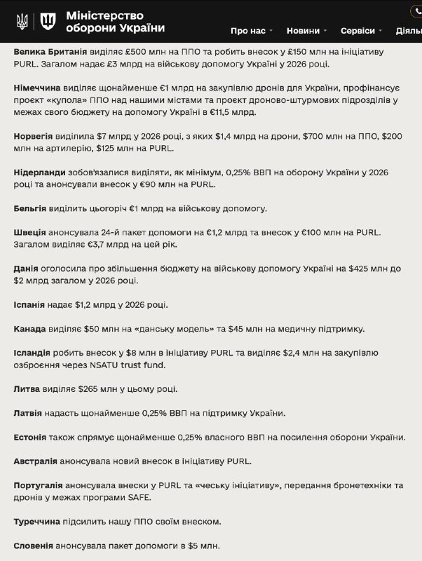 Понад $6 млрд – у конкретних пакетах допомоги, включаючи понад $2,5 млрд на українські дрони, понад $500 млн на американську зброю за програмою PURL, $2 млрд – на ППО, а також кошти на артилерійські боєприпаси, підготовку, морські можливості та інші напрямки.