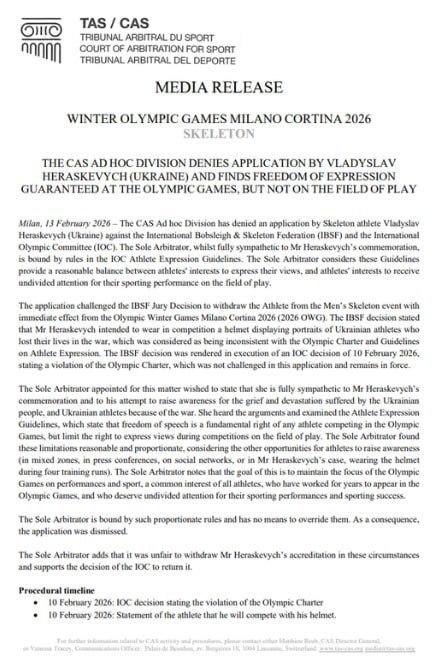 19:02 Спортивний арбітражний суд відхилив позов українського скелетоніста Владислава Гераскевича проти МОК, йдеться у його релізі.