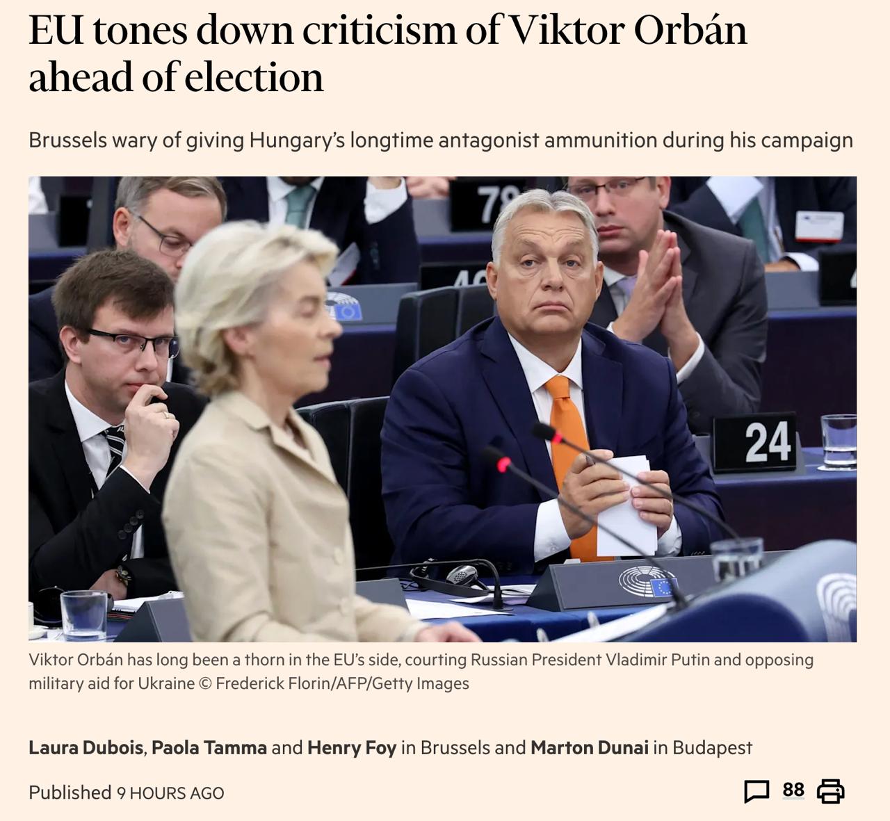 Європа пом'якшує критику Орбана перед виборами в Угорщині, щоб її не звинуватили у втручанні - FT
