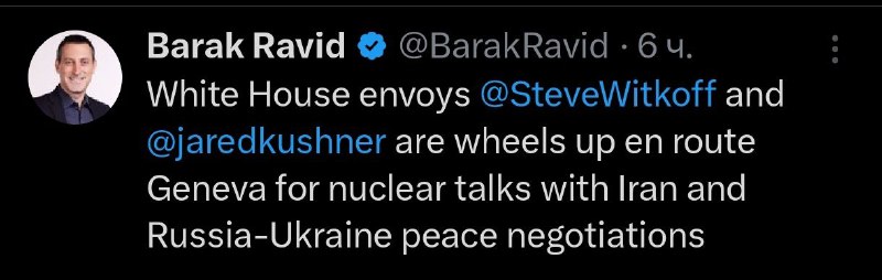 07:50 Представники Трампа Уіткофф та Кушнер вилетіли до Женеви для переговорів з делегаціями Росії та України. Про це повідомив журналіст Axios Барак Равід.