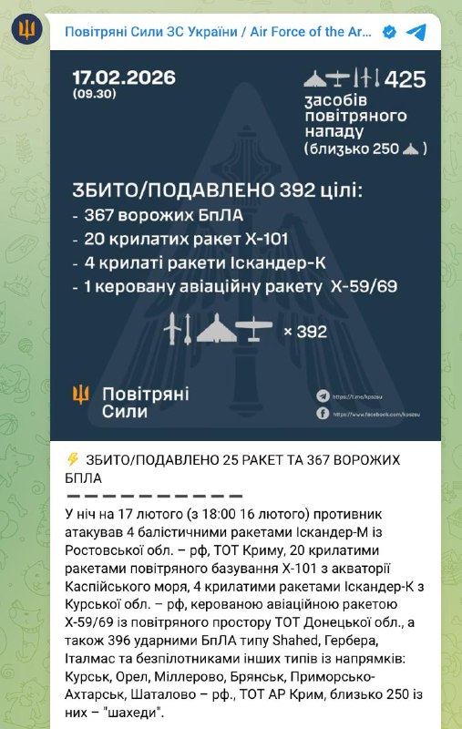 09:35 Україна цієї ночі не збила 4 балістичні ракети, що летіли, решту 25 ракет вдалося збити, повідомляють Повітряні сили ЗСУ.