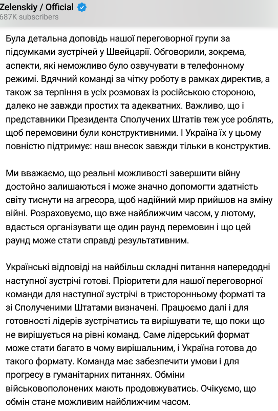 Про це заявив у своєму телеграм-каналі український президент Володимир Зеленський за підсумками зустрічі із переговорною делегацією України.