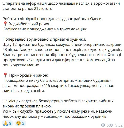 "Хаджибейський район: зафіксовано пошкодження на трьох об'єктах. Попередньо зруйновано два приватні будинки. У ще 12 приватних будинках комунальники оперативно закрили 43 вікна. Також частково відновлено покрівлю одного з будинків. Вранці триває вивезення зібраного будівельного сміття. Фахівці продовжують складати. Приморський район: пошкоджено низку багатоквартирних житлових будинків - всього постраждало 115 квартир.