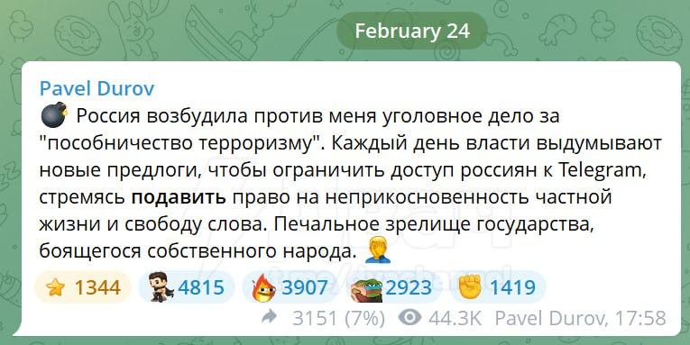 Засновник месенджера Телеграм Павло Дуров прокоментував порушення проти нього в Росії кримінальної справи за допомогу тероризму.